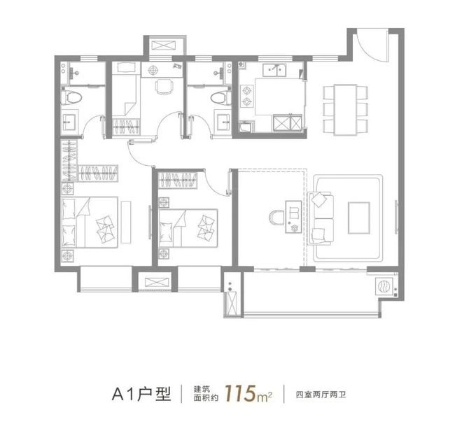 约115㎡的改善型4房,既实用又具有性价比。4开间朝南的设计,尺度感和采光度都很强,还有南向超大宽面阳台、整体南北通透的格局,轻松满足三代同堂或三胎家庭的生活需求!
