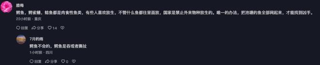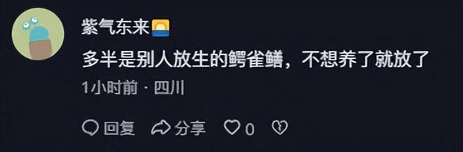 重庆一位网友则建议道:鳄鱼,鳄雀鳝,鲶鱼都是肉食性鱼类,有些人喜欢放生,不管什么鱼都往里面放,国家是禁止外来物种放生的。唯一的办法,把池塘的鱼全部网起来,才能找到凶手。